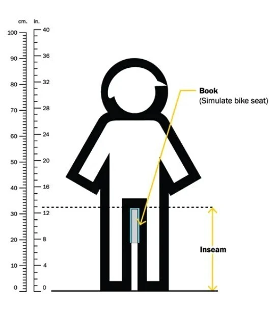 Easy. Have your child stand up really straight with their shoes on (you can have them stand with their back to a wall if that helps). Place a book between their legs and slide it up the wall to meet the crotch seam of their pants, just like they were sitting on a bike saddle. Measure from the top of the book to the floor and….BINGO! You have your inseam.